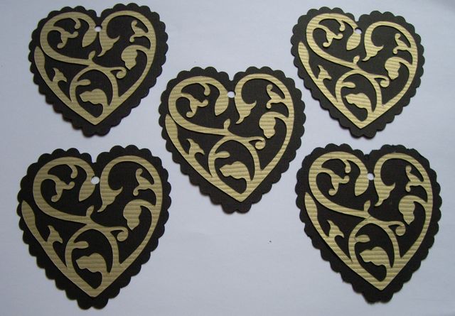 First of all there are Small Heart Labels, which are 3 inches at the longest part. I used gold corrugated card for the backing and plain black card for the pretty lace effect on top.